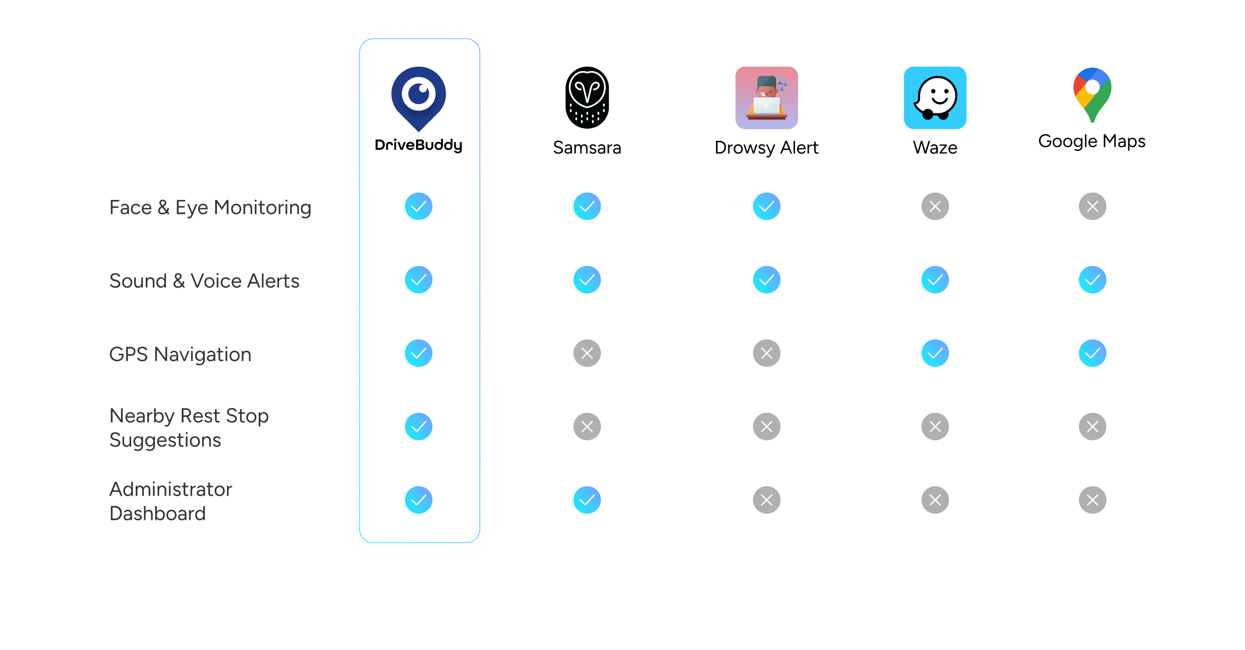 DriveBuddy is an AI-powered mobile app designed to help drivers stay safe by detecting early signs of drowsiness. Face and eye monitoring technology tracks signs like frequent blinking or closed eyes. Instant sound and voice alerts notify drivers when signs of fatigue are detected. Nearby rest stop suggestions encourage timely breaks to recharge. Administrator Dashboard provides real-time insights into driver safety, alerting companies to potential risks before they become incidents.