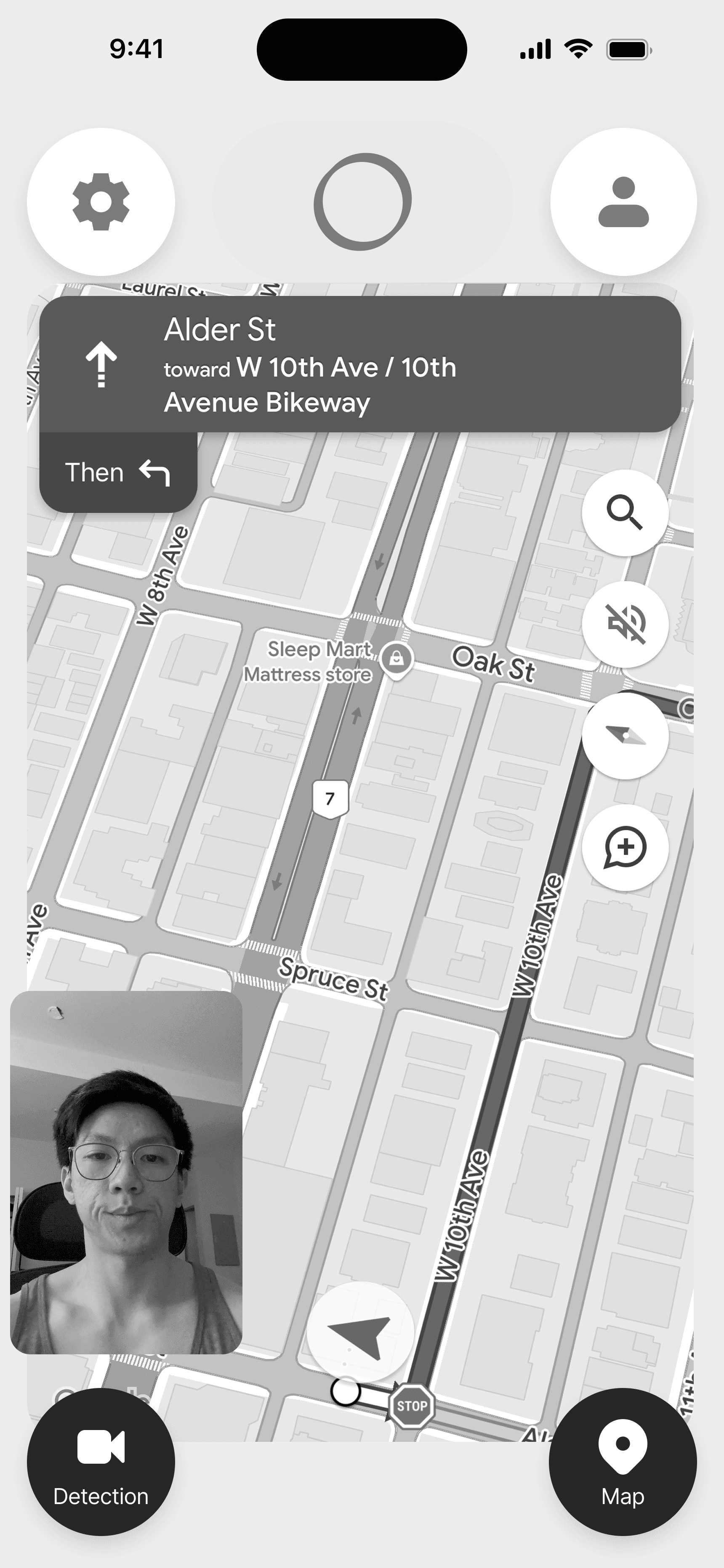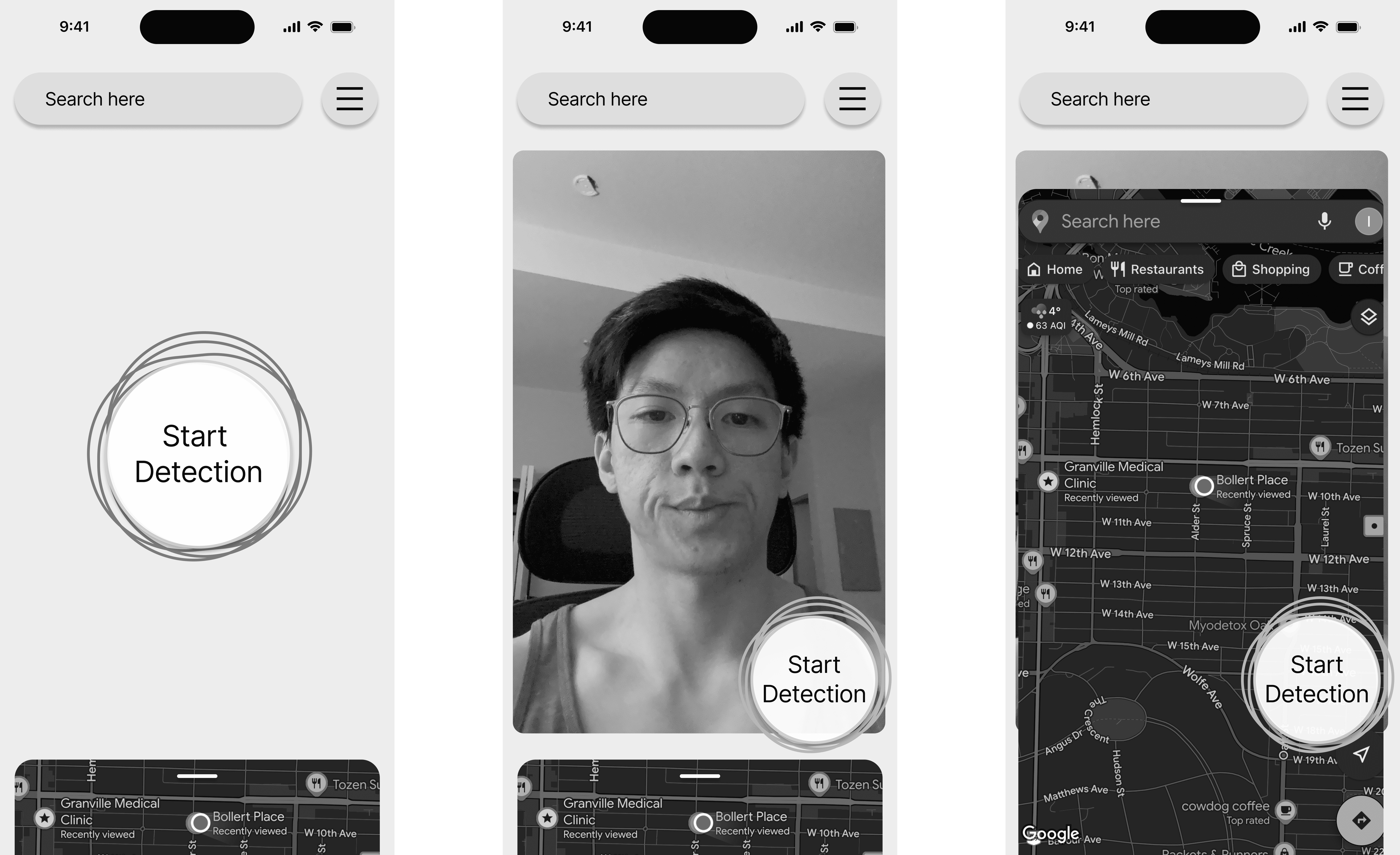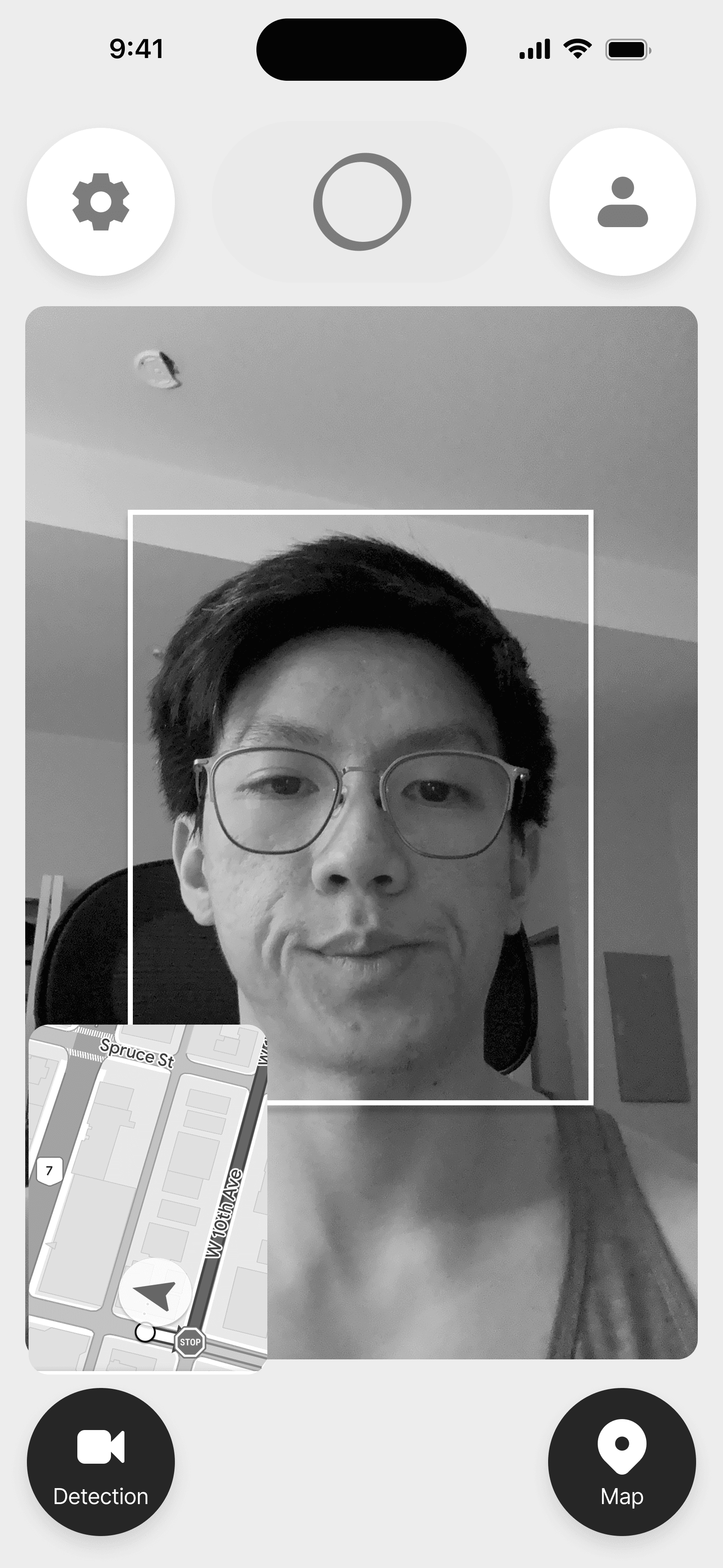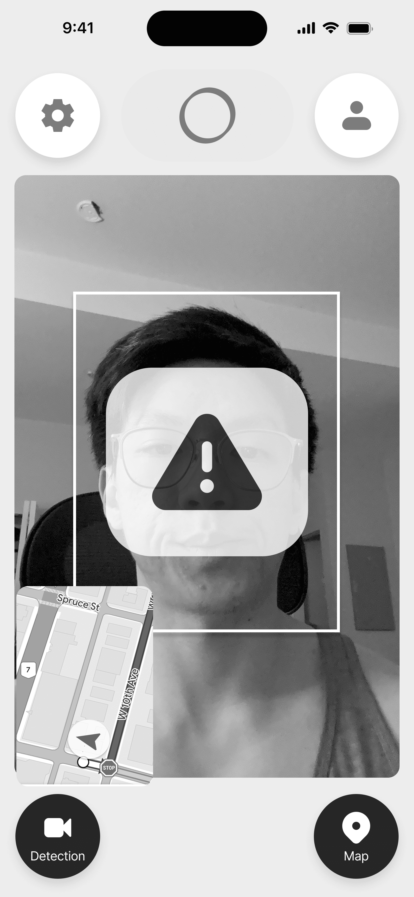 For the face and eye detection interface, I felt it was appropriate to borrow the design pattern that users are familiar with when video chatting on FaceTime or WhatsApp. Users see a display of their front-facing camera, which can be shrunken or enlarged. Users can also tap the video to toggle between the camera and the map.