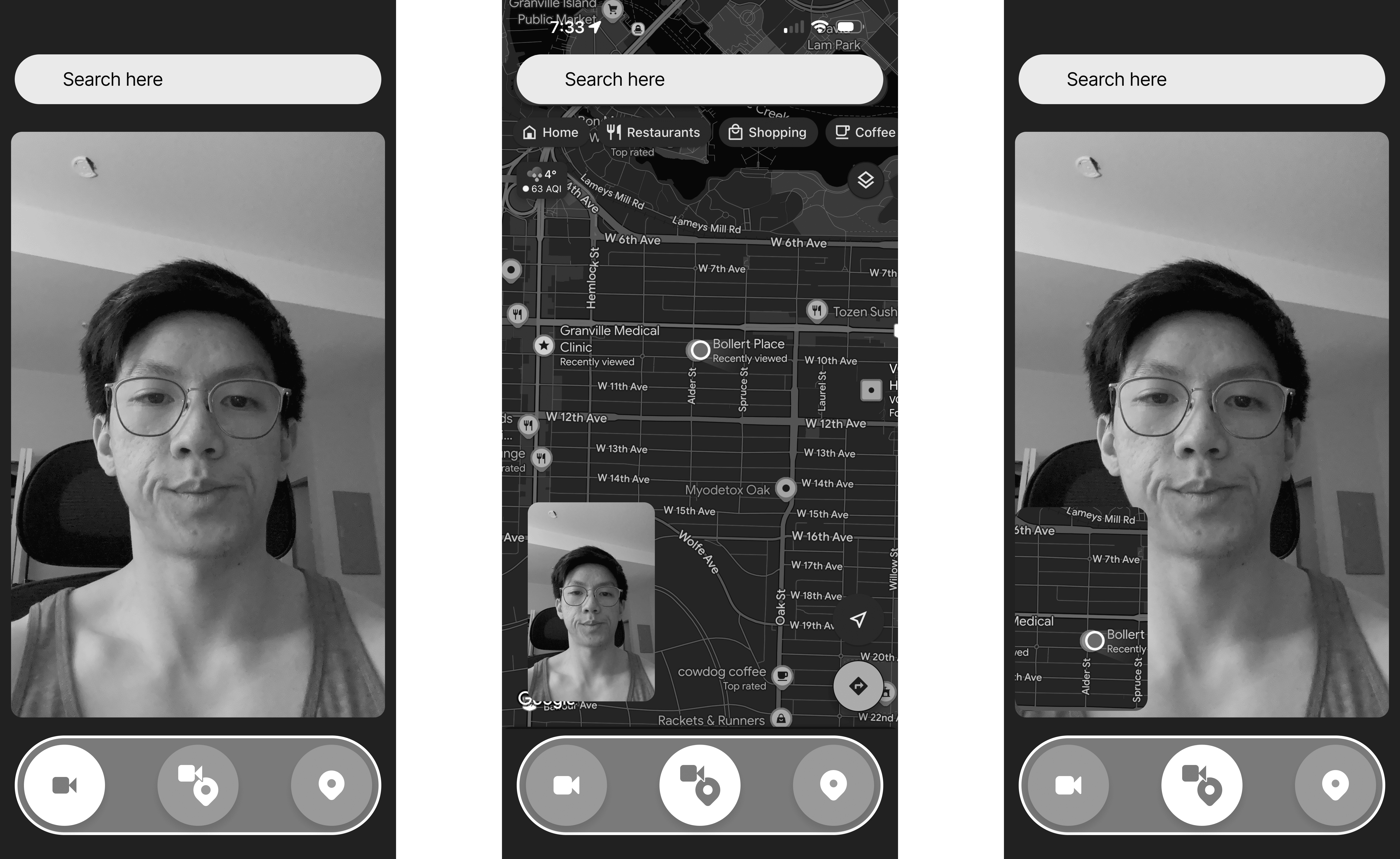 The second variation is very different from version 1 in that there is always a dock from which users can toggle the map, the camera, or both.